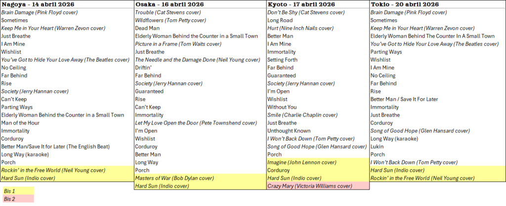 Los setlist no han tenido grandes sorpresas, rondando los 22-24 temas, y como hace habitualmente mezclando un pocos canciones de sus discos en solitario, de Pearl Jam y versiones varias. Un total de 44 temas diferentes teniendo en cuenta los cuatro conciertos.